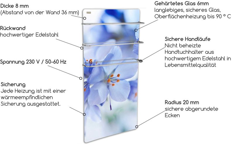 Das natürliche Prinzip der Heizung sorgt dank derbeheizten Handtuchhalter aus HGlass-Glas für ein angenehmes Gefühl von Gemütlichkeit und Komfort in Ihrem Badezimmer. Der Handtuchwärmer HGlass GHT kann als eigenständige Heizung in Ihrem Badezimmer verwendet werden und ist auch ideal zum Trocknen von Handtüchern. Die Grundanzahl der Handtuchhalter hängt vom Modell des glasbeheizten Handtuchhalters ab. Mit unseren einzigartigen Halterungen können Sie jedoch so viele Handtuchhalter hinzufügen, wie Sie benötigen.