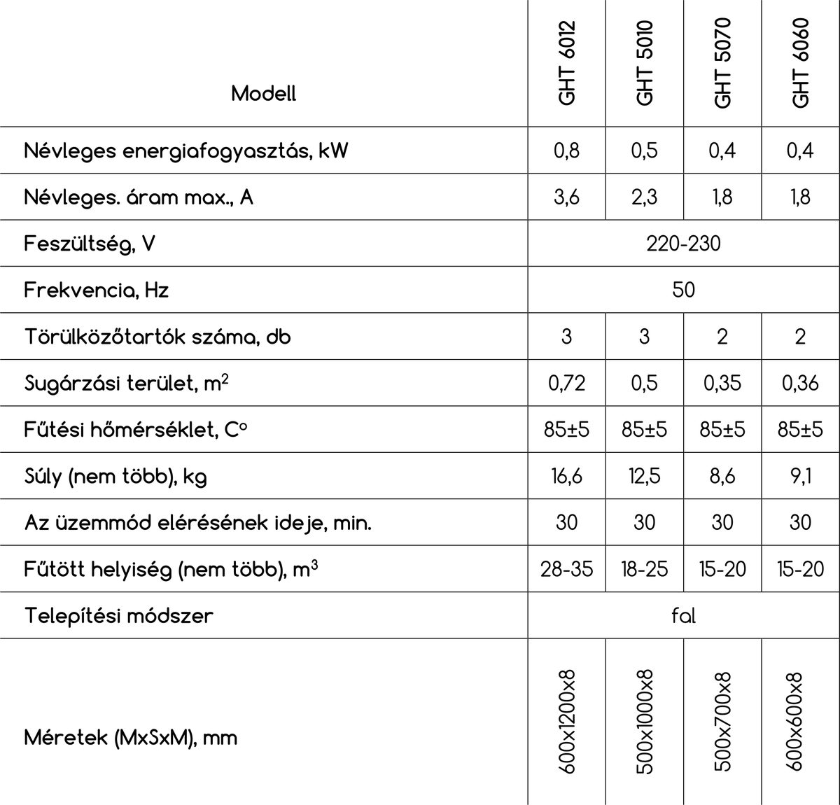 Az IGH 6012, IGH 6060 melegítőknek és a GHT6012, GHT 6060 törölközőszárítóknak