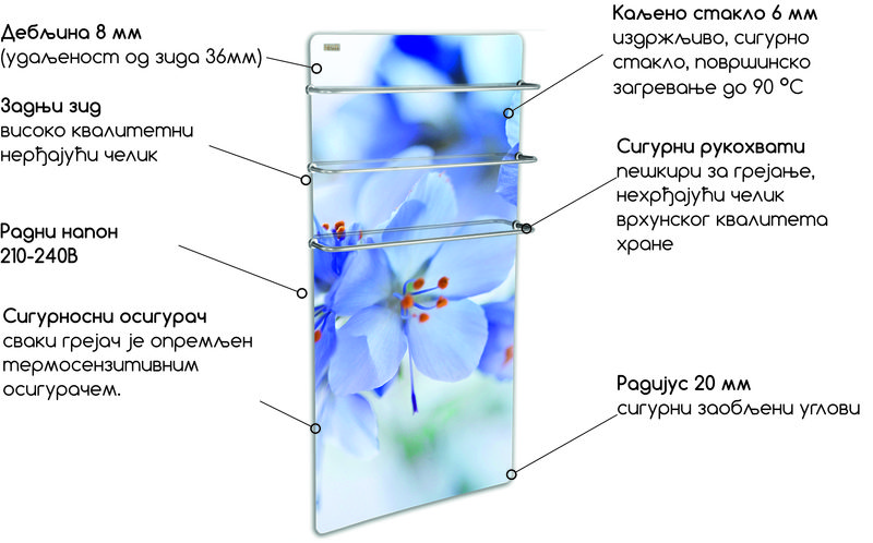 Cтакленим шипкама за грејање. HGlass GHT грејач за пешкире може се користити као самостални грејач у вашем купатилу, а идеалан је и за сушење пешкира. Основни број држача пешкира зависи од модела стаклене пешкире, али јединствени носачи које су развили наши стручњаци омогућавају вам да додате онолико држача пешкира колико вам треба.