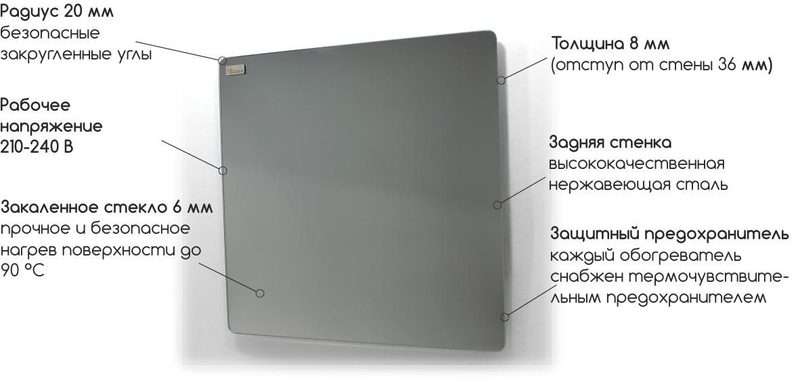 Лицевая сторона обогревателей серии HGlass изготовлена из закаленного стекла, а задняя часть - из высококачественной нержавеющей стали. Обогреватель обладает высокой эффективностью, благодаря особой конструкции и свойствам нагревательного элемента.