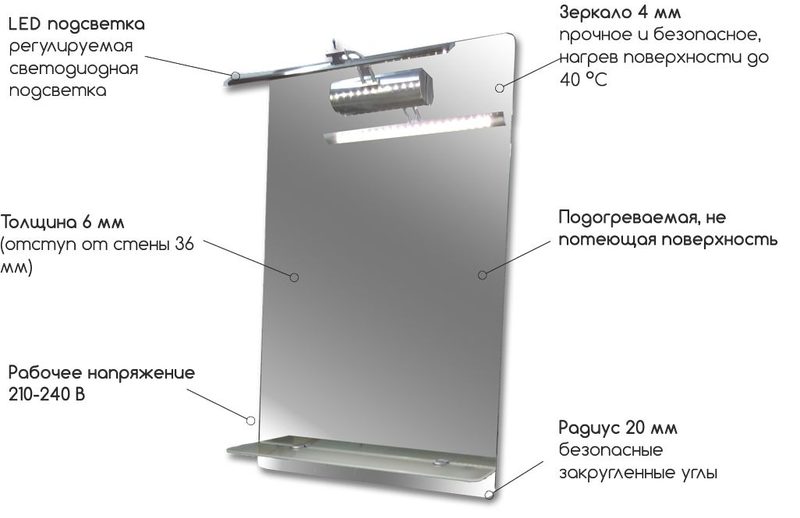 Некоторые модели дополнены стеклянной полкой и светодиодной лампой на специальном подвижном кронштейне. Подсветка имеет отдельную кнопку включения, что позволяет не включать обогрев зеркал без необходимости.