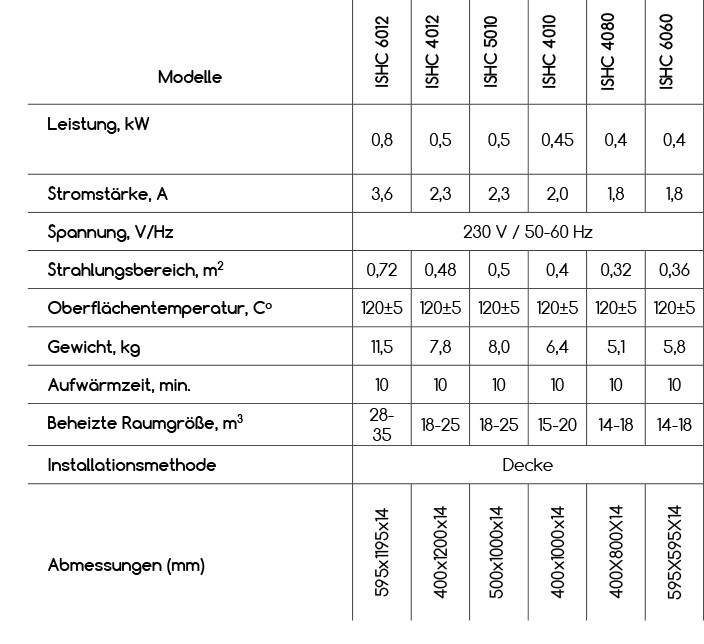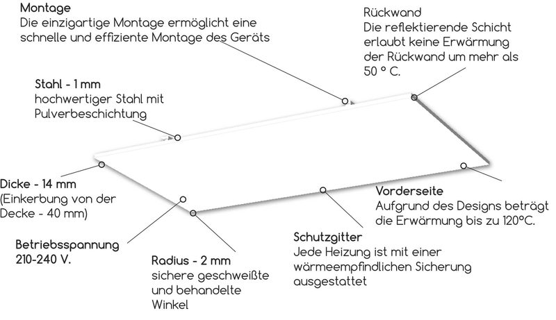 Erhitzen der Platte auf 120 ° C, wodurch die gesamte Raumhöhe und der Boden im Bereich unter der Platte erwärmt werden können. Die elektrische Infrarotheizung mit HSteel Metallheizungen spart im Vergleich zu alternativen Heizsystemen bis zu 60% Energie. Stahlpaneele kombinieren Infrarotwärme mit optimaler spektraler Leistung für außergewöhnlichen thermischen Komfort und Deckenplatzierung. Dank dieser beiden Funktionen schafft der Raum Hochwertige Wärmeheizung: Gleichmäßige Wände und Gegenstände im Raum. Der hohe Wirkungsgrad von HSteel-Platten beruht auf dem besonderen Design und den Eigenschaften des Heizelements, einer großen Wärmeaustauschfläche sowie der Stabilisierungsgeschwindigkeit des Prozesses, die ein Kriterium für die Bewertung des Wirkungsgrads darstellt. Dank der ursprünglichen Anordnung des Heizelements auf der gesamten Oberfläche der HSteel-Platte wird die schnellste Stabilisierung des Prozesses erreicht. Eine HSteel-Deckenplatte (0,40 kW) kann eine Fläche von bis zu 4 m² heizen. Dank der Verwendung von Temperaturreglern arbeitet das System nur 5-7 Stunden am Tag. Im Vergleich zu alternativen Heizsystemen ist HSteel etwa dreimal wirtschaftlicher. Die Installation der Paneele ist sehr einfach und kann in kürzester Zeit durchgeführt werden. Deckenheizungen HSteel sind eine hervorragende Lösung sowohl für die lokale Heizung als auch für die Heizung des gesamten Raums. Aufgrund ihrer Designmerkmale können die Paneele auch in abgehängten Decken vom Typ «Armstrong» platziert werden.
