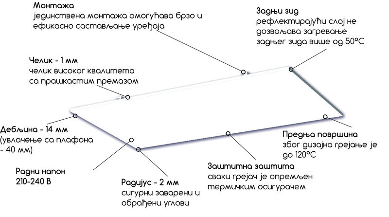 Челични панели комбинују инфрацрвену топлину са оптималним спектралним карактеристикама, што ствара изузетну топлотну удобност и могућност постављања на плафон. Захваљујући ове две карактеристике, у соби се ствара висококвалитетно термичко грејање: равномерно зидови и предмети у соби