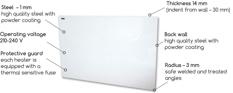 HSteel panels combine two principles of heating: mild convection heat which warms air (in this case no oxygen burn occurs) and infrared heat with optimal spectral characteristics, which creates exceptional thermal comfort. Thanks to these two principles, quality heat exchange is created in the room; objects in the room, walls, air are heated evenly.